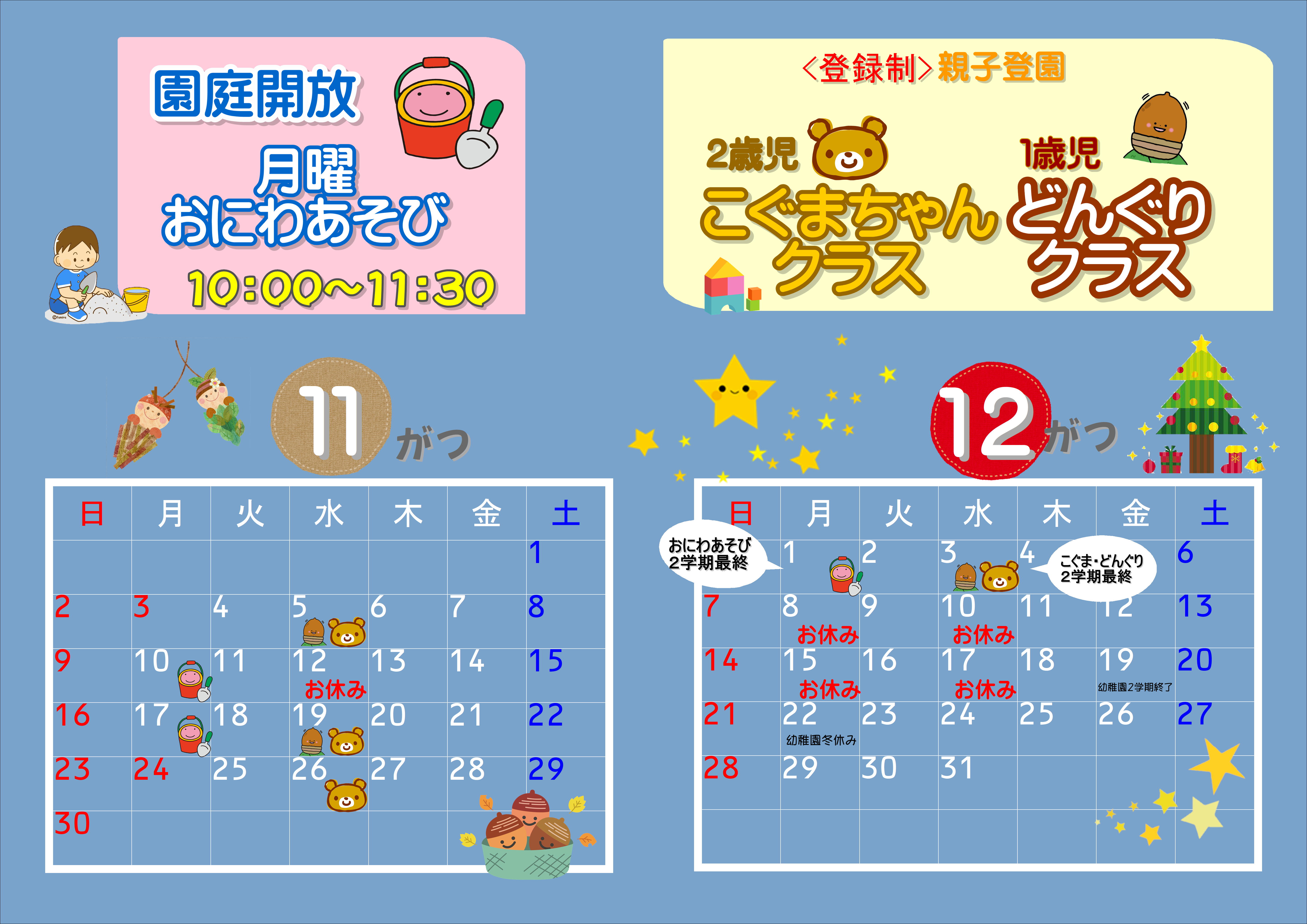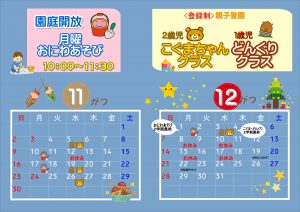 2025.10.22 子育て支援11月・12月予定 幼稚園の行事のため10月後半の園庭開放・未就園児クラス共にお休みになっています。 次回は11月です。たくさんのご参加お待ちしております。 《2歳児こぐまちゃんクラス・1歳児どんぐりクラス登録受付中です。》 11月・12月の予定です。
