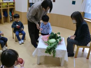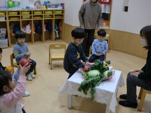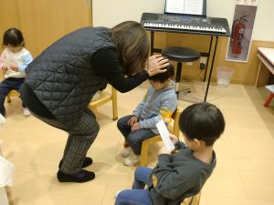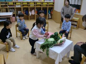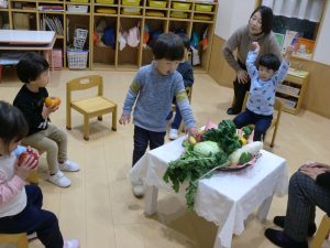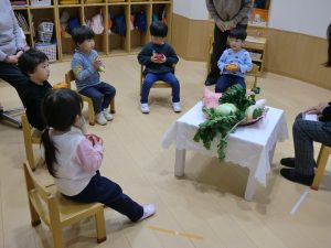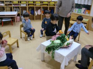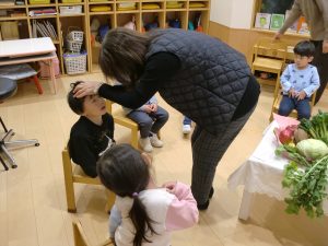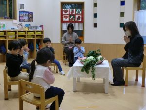 大岡先生にお部屋に来ていただいて、みんなが持ち寄った果物や野菜をおささげして感謝のお祈りをしました。